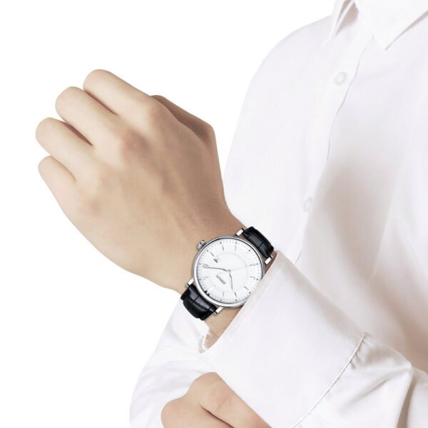 Bộ máy thạch anh Ronda Thụy Sĩ uy tín đảm bảo khả năng vận hành chính xác với các chức năng giờ, phút, giây và lịch ngày. Dây đeo da thật màu đen họa tiết cá sấu mềm mại, chắc chắn ôm sát cổ tay, phối hợp cùng khóa thép bền bỉ tăng thêm vẻ nam tính, lịch lãm cho người đeo.