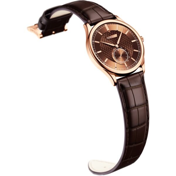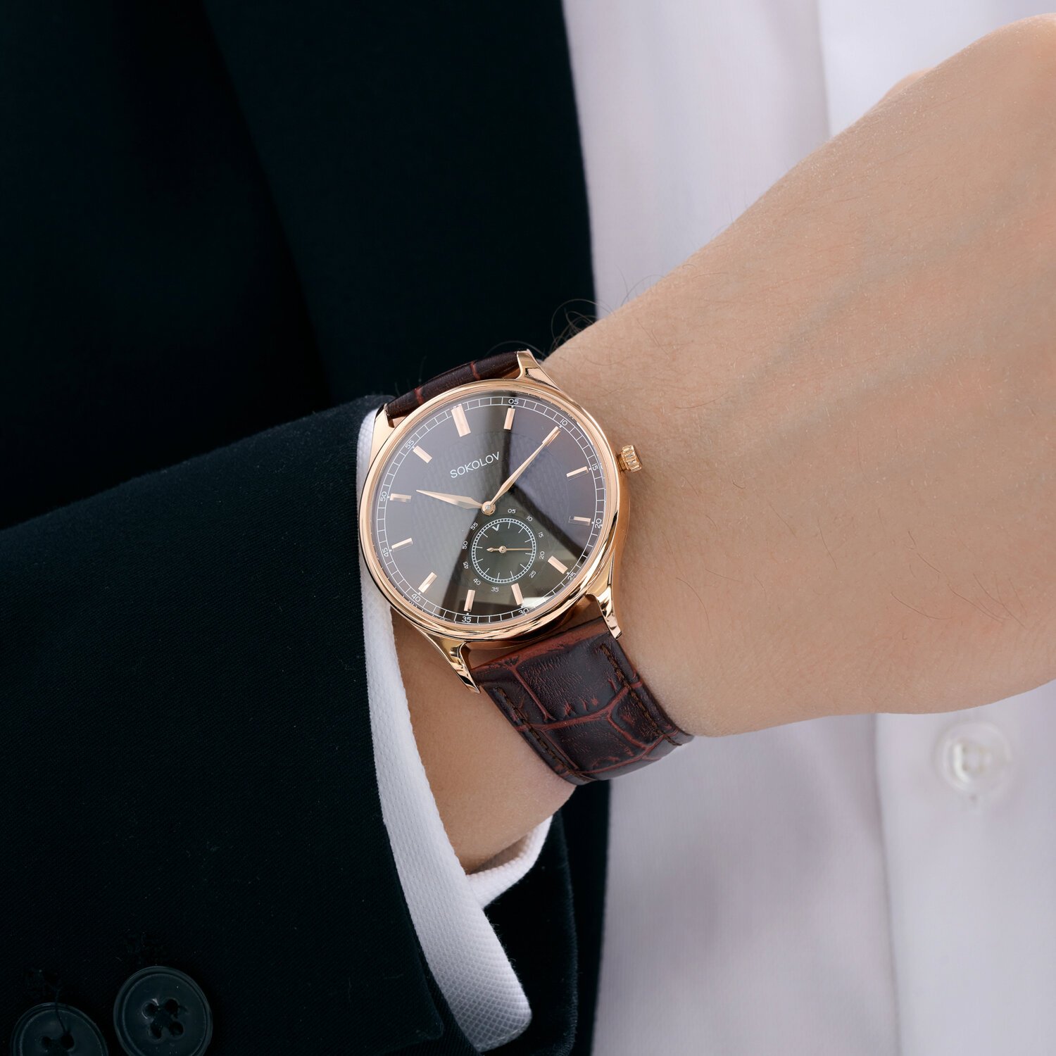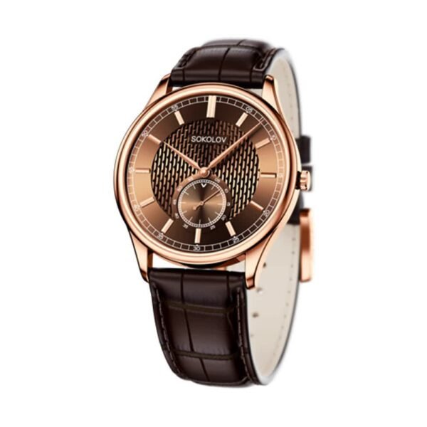 Chiếc đồng hồ SOKOLOV thuộc bộ sưu tập Triumph dành cho quý ông hiện đại, nổi bật với vỏ vàng hồng 585 cao cấp, đường kính 38 mm và độ dày 7,3 mm mang lại sự thoải mái khi đeo. Mặt số màu nâu sang trọng với họa tiết nổi bật, kết hợp các cọc số và kim chỉ giờ mạ vàng hồng, tạo nên sự lịch lãm và nam tính.