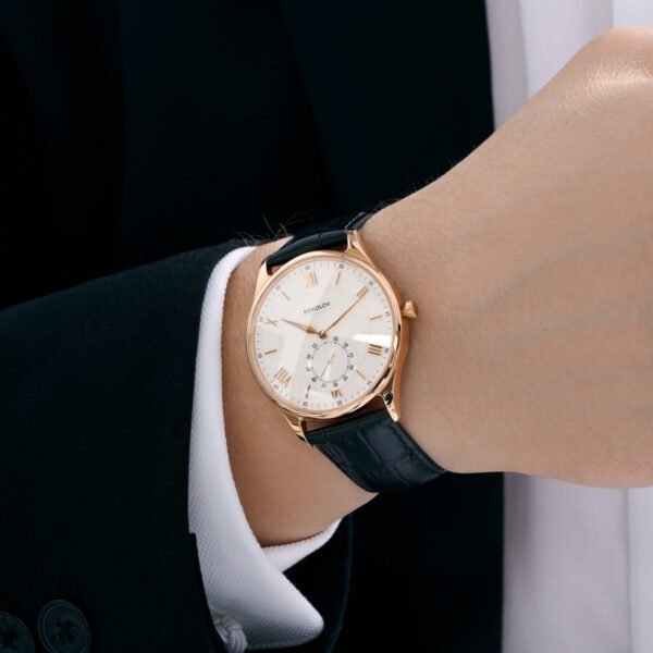 Đồng hồ vỏ vàng 585 tròn thanh lịch với mặt kính sapphire chống trầy xước, thiết kế tinh tế đi cùng bộ máy thạch anh Thụy Sĩ chính xác. Dây da Ý mềm mại, khóa mạ vàng sang trọng, tạo nên vẻ đẹp hoàn hảo và thoải mái khi đeo.