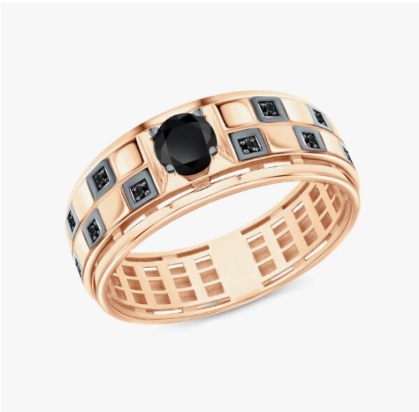 Chiếc nhẫn nam từ thương hiệu “Московский Цепевязальный Завод” kết hợp giữa vàng hồng 585 cao cấp và đá quý đen sang trọng, tạo nên vẻ đẹp độc đáo và tinh tế. Viên đá chính lớn màu đen cùng các viên đá nhỏ đính xen kẽ trên thân nhẫn với họa tiết cá tính, mang đến vẻ quyền lực và cuốn hút đặc biệt.
